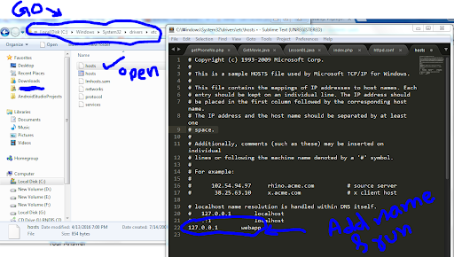Setup domain name for localhost. Open the file with a plain text editor like notepad or sublime text. In the hosts file you should see something similar. Right below the line 127 0 0 1 localhost enter your domain name information.
